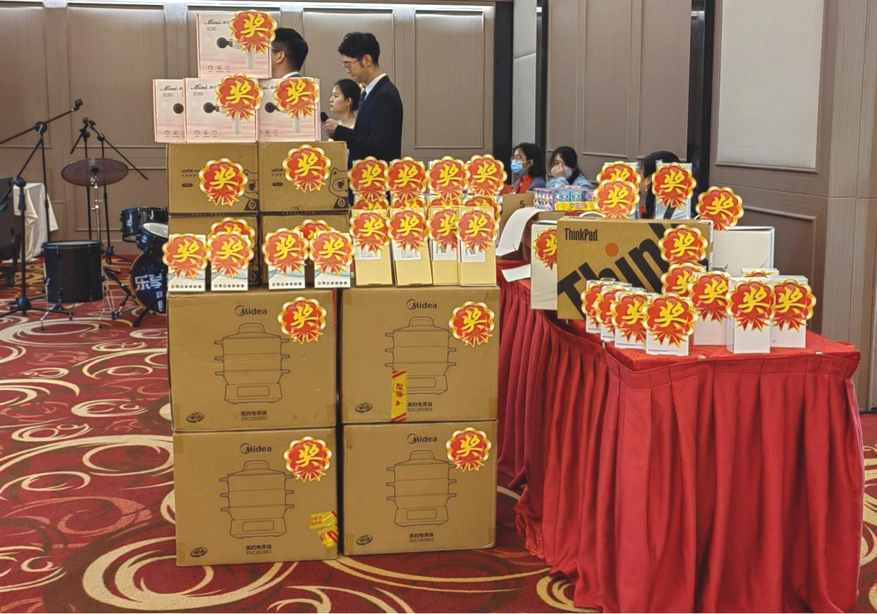 下午2点,伴随着喜庆悦耳的暖场音乐,签到入场,每人领取一份伴手礼和抽奖券,现场气氛欢快热烈,伴随着开场视频倒数计时结束,年会正式拉开帷幕。