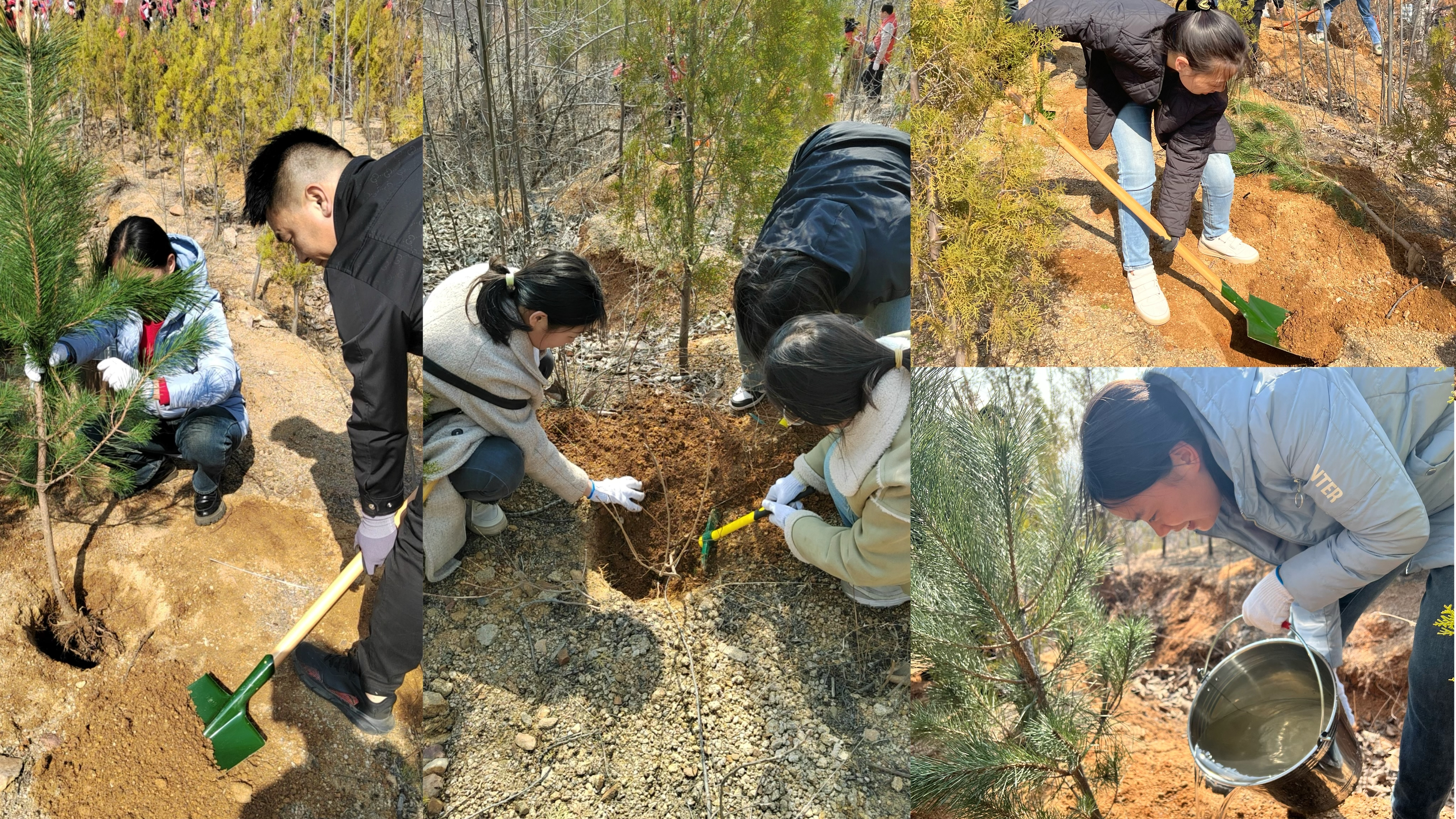 早春三月,正是种植的好时节。大家个个热情高涨,用铁锹、镐、水桶等工具,实践了挖坑、扶苗、填土、踩实、浇水等种植过程,汗水逐渐浸湿了衣衫,但是大家热情不减。看着一株株栽种完成的树苗,大家都由衷感到开心和满足。
